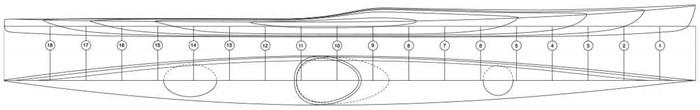 The cockpit is drawn to my favorite size: 53x38 cm with a height difference between fore and aft deck to make entering quick and easy, and still offer rolling qualities on par with dedicated Greenland rolling kayaks. Thus, the deck is very low compared to common competition kayaks - I use the knees against the underdeck to power my upper body rotation. But indicated on the plans is also a more "normal" deck height for those used to the vigorous competition style pumping of the knees. It is also very simple to build the kayaks longer or shorter or with another cockpit shape or size - these options are described in the plans.
