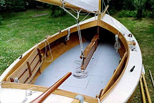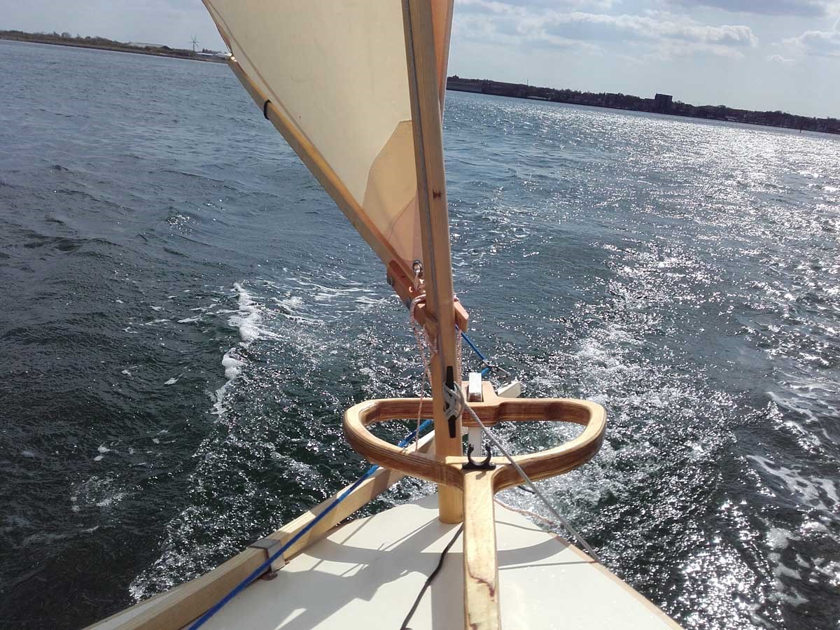 Riggen som i original är en så kallad "dipping lug", ändrade jag till en (aningen) modernare "standing lug" och lade till en fock. Dipping lug är ett effektivare segel, men har nackdelen att det måste tas ner var gång man slår och hissas på andra sidan masten (på en så liten båt som den här räcker det oftast att lyfta bommen till andra sidan av masten och dra lite i förliket innan man passerar vindögat så att vinden drar över spriet) – jag valde att offra ett uns effektivitet för bekvämligheten med ett självslående storsegel. I gengäld kunde jag då lägga till en liten fock på bogspröt, vilket sannolikt mer än väl kompenserar segeleffektiviteten.
