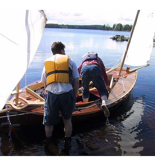 Vidare ökade jag i modern anda bärigheten i akterskeppet en aning för att dels förbättra fartresursena något och dels för lite bättre balans när man seglar ensam från aktertoften (eller som på bilden ovan, men många barn som trängs kring rorkulten ;-), och konstruerade ett uppfällbart roder, så att man skall slippa lyfta av det för att gå in till land.