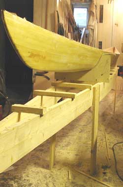 Everything looked OK this morning and I cut the stems, removed the molds and turned the hull. A couple of negative molds (leftovers from the particleboard) was bolted to the strongback with a soft covering as protection, to support the hull. Now I removed the scarph pieces temporary glued to the sheer strips and keel. I lowered the strongback from the saw horses by bolting short legs to it, giving better access to the inside - important for both effectivity and result.