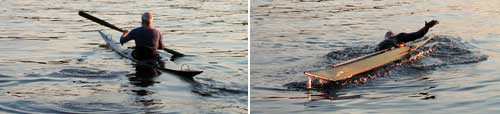 I tältet berättade Sten E Karlsson till bilder om sin grönlandsresa och deltagande i Grönlandsmästerskapen i kajakpaddling – mycket spännande att få en förstahandsrapport från dessa tävlingar som komplement till otaliga tittar på ”Amfibiemannen” mm. Per Vestling berättade om multisporttävlingar och de olika paddelmoment som kan ingå. Vi fick också en intressant moment-för moment-redogörelse för en fyra-dagars tävling i Newfoundland. Hasse Friedel höll en kort föredragning om hur man konstruerar en kajak i Cad/Cam-miljö. Jag hade fått fyra timmar totalt på lördagseftermiddagen för att berätta om paddelteknik för långfärd, säkerhet, räddning, paddling i vind och sjögång, grönlandspaddling mm, men när temperaturen i tältet gick över 30° bytte jag ut sista timmen mot praktisk demonstration och instruktion i vattnet (assisterad av Sten E).