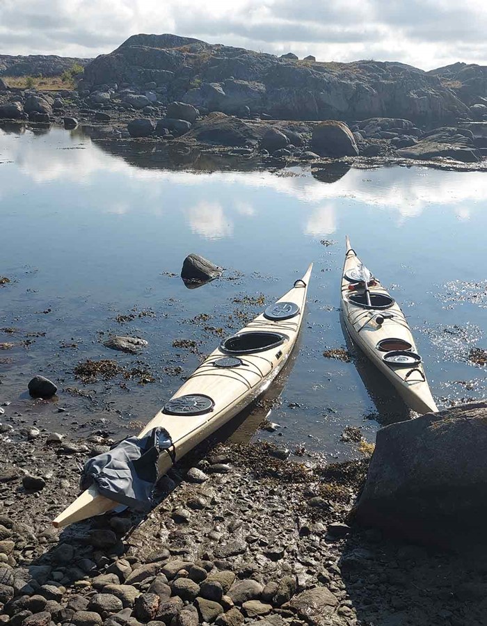 Den första Nanoqen blev klar till förra sommaren och den andra blev klar till denna sommar. De är mer eller mindre identiska. Något kortade, till 5,20m som vi en gång kom fram till. Det var klokt, de ligger bra i vattnet även utan packning. Ribborna är av prima gran från Härryda. Med köpeprylar till luckor, fotstöd, sits o skedda landade vikten på drygt 19 kg denna gång.